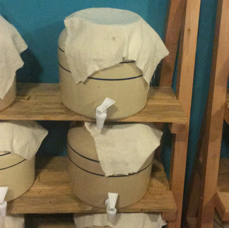 Luego están mis hongos. Me he dedicado por casi seis años a hacer kombuchas. En algún momento cuando pensé que podría ser un negocio compré al por mayor dispensadores de cerámica y ahora tengo una docena y muchísimos hongos. Me dedico semanas enteras a preparar cada uno de estos galones con su respectivo hongo e inicio cultivos nuevos con té azucarado y les asigno casa.
