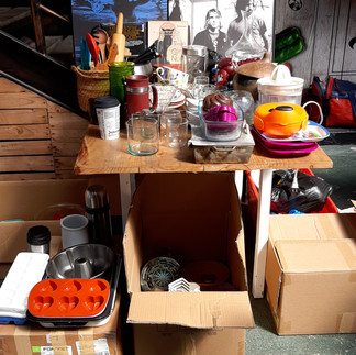 En la primera etapa me ocupo de todas esas cosas con las que no tenemos afinidad o historia y también las cosas que están en buen estado y pueden tener algún valor económico. Aquí hay vajillas, ollas de fondue, extractores de jugo, bandejas, platos, copas, cubiertos cosas elegantes que nunca hemos usado, porque estaban guardadas para el día en el que seríamos más elegantes y eso no pasó.